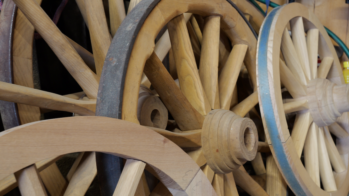 L’atelier de charronnage est aménagé dans l’espace précédemment dédié au sciage des grumes et au débitage des plateaux.  Il a été équipé de manière à permettre la réalisation future du projet de remise en service de la scie d’origine.  On y fabrique une grande variété d’objets, notamment des meubles, des outils de jardinage et de travail à la campagne, tels que les chars, les brouettes et les luges.